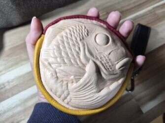表面には、迫力のある鯛を立体的に加工し、背面は色違いの本革を使用しています。